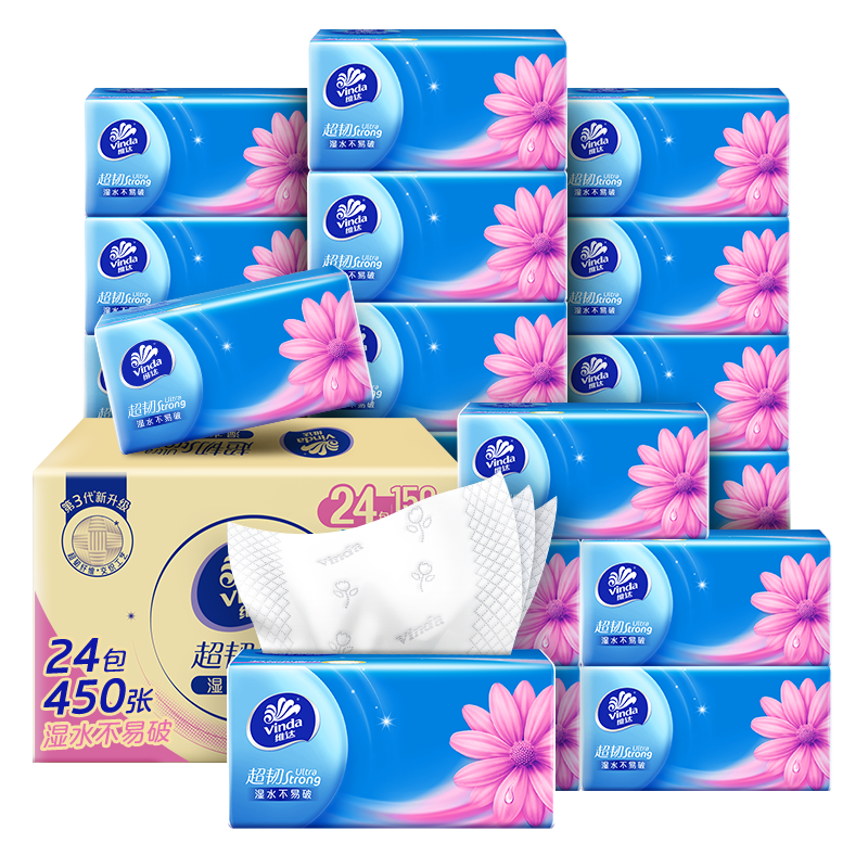 维达(Vinda)抽纸 超韧3层150抽*24包 真S码 湿水不易破 卫生纸 餐巾纸 整箱