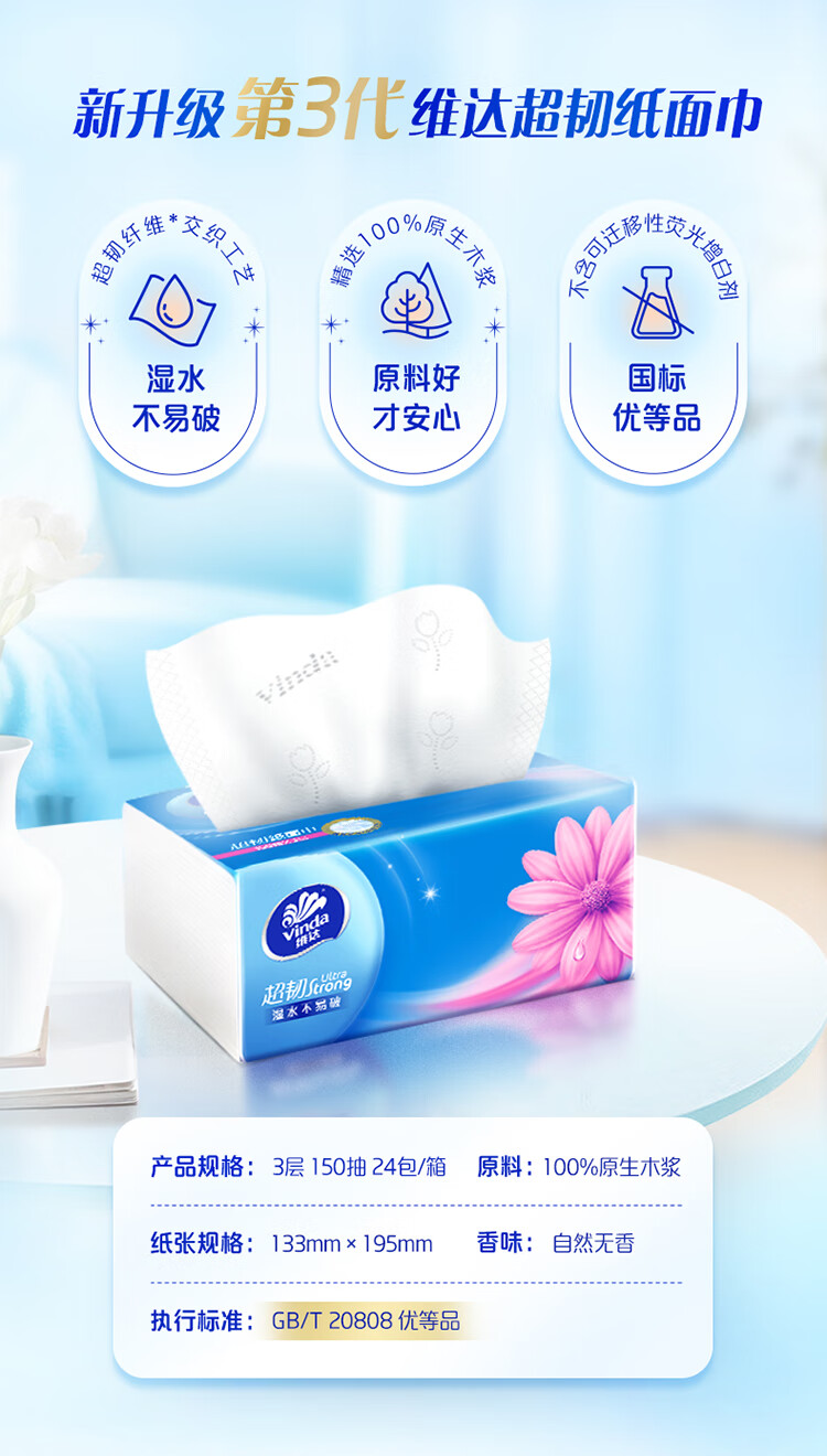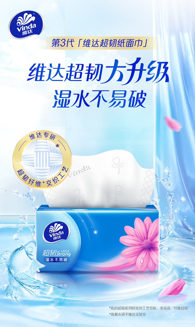 包装清单: 维达(Vinda) 抽纸 超韧3层150抽*24包 真S码 湿水不易破 卫生纸 餐巾纸 整箱